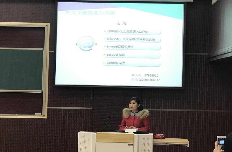 2017年4月27日上午8时,辅导员李晓晓老师在伟德bv国际体育MBA教室主持召开“学习外文文献检索与利用”活动,本次活动特邀到校图书馆咨询处魏小贞老师向同学们开展讲座。15级中美合作办学项目全体同学参加了此次活动。