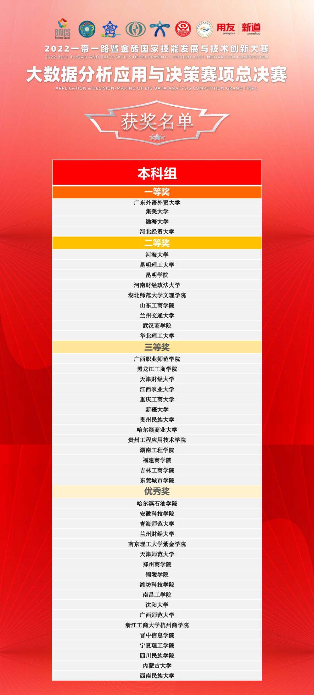 2022年10月23日,2022一带一路暨金砖国家技能发展与技术创新大赛(大数据分析应用与决策赛项)总决赛在线上圆满结束。伟德bv国际体育参赛团队在比赛中脱颖而出,荣获全国总决赛一等奖。