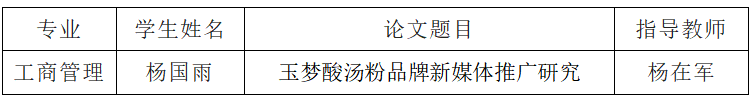 经公司推荐,公司评审,公司2018级工商管理专业杨国雨同学的毕业论文《玉梦酸汤粉品牌新媒体推广研究》被评选为2022年度优秀本科毕业论文(设计),论文指导教师杨在军被授予“2022年度优秀本科毕业论文(设计)指导教师”荣誉称号。