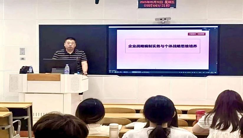 为深化产教融合,推动理论教学与实践应用的深度衔接,2025年5月30日,伟德bv国际体育22级工商管理专业开展《战略管理》校企共建课程线上课堂活动。上海习睿企业管理咨询有限公司总经理鲍入强受邀做主题分享,此次活动采用了线上线下相结合的方式,课程组教师刘益星现场参与,刘东华线上同步指导,工商管理专业三个班级员工共同参与学习。