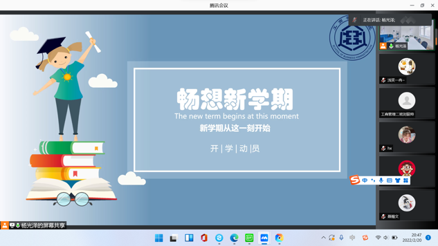 2022年2月20日公司举行以“新学期 新起点”为主题的会议,此次会议由20级工商管理专业一班杨光泽主持,工商管理公司党委副书记范伟,团委书记贾晶晶到场,20级工商管理专业、20级人力资源管理专业(中外合作办学)、21级智慧工商管理专业全体同学参加。
