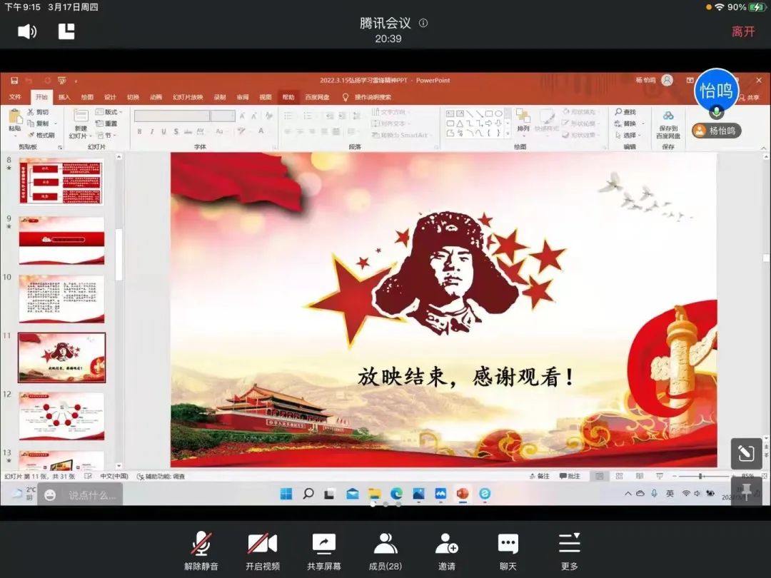 会议伊始,杨怡鸣介绍了本次班会的主要内容,通过播放志愿者抗“疫”经历的感人事迹,引导同学们向抗“疫”逆行者们致敬,主动学习他们身上的雷锋精神,并鼓励同学们要在今后的学习和生活中发扬雷锋精神。随后,孙树杰结合公司当前的疫情封闭管控情况,从同学们的学习情况、日常生活、人际交往等方面提醒同学们要严格遵守校规校纪,提高自我防范意识。