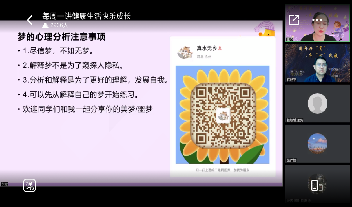 会议伊始,主讲人李立老师通过梦境的知识引出本次讲座的主题:梦的心理分析——打开心灵世界的密码。紧接着,李立通过众多案例,带领同学们认识梦境是如何产生的,进而打破同学们对梦境的常规理解,刷新并加深同学们对梦境的正确认识。最后,李立与同学们积极沟通互动,她认为好的梦境是我们对生活的向往,而坏的梦境并不代表着噩运,鼓励同学们要正确清晰地看待梦境。