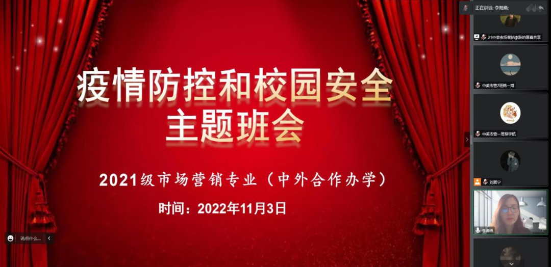为使同学们充分认识疫情防控的严峻形势,引导员工树立校园安全防范意识,加强自我防护,11月3日上午,伟德bv国际体育2021级市场营销专业(中外合作办学)召开“疫情防控和校园安全”主题班会,此次活动由辅导员李海燕主持,2021级市场营销专业(中外合作办学)全体同学通过腾讯会议参加。