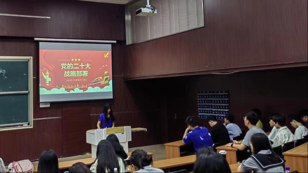 为深入贯彻落实党的二十大精神对党的建设做出的重要论述和战略部署,进一步增强青年员工的思想觉悟,6月5日,伟德bv国际体育2022级工商管理类三班于伟德bv国际体育MBA2教室开展了以“党的二十大战略部署”为主题的团日活动。本次活动由团支书安文苗主持,2022级工商管理类三班全体成员参加。