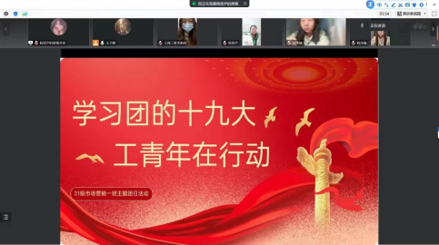 为深入学习团十九大精神、党中央致词、团十九大报告,积极响应党中央号召,为本班团支部“找差距、补短板”“再出发、在奋进”,7月22日,伟德bv国际体育2021级市场营销1班于线上开展了以“学习团的十九大,工商青年在行动”为主题的团日活动。本次班会由团支书王子穆策划,宣传委员程思尹主持,2021级市场营销一班全体同学参加。
