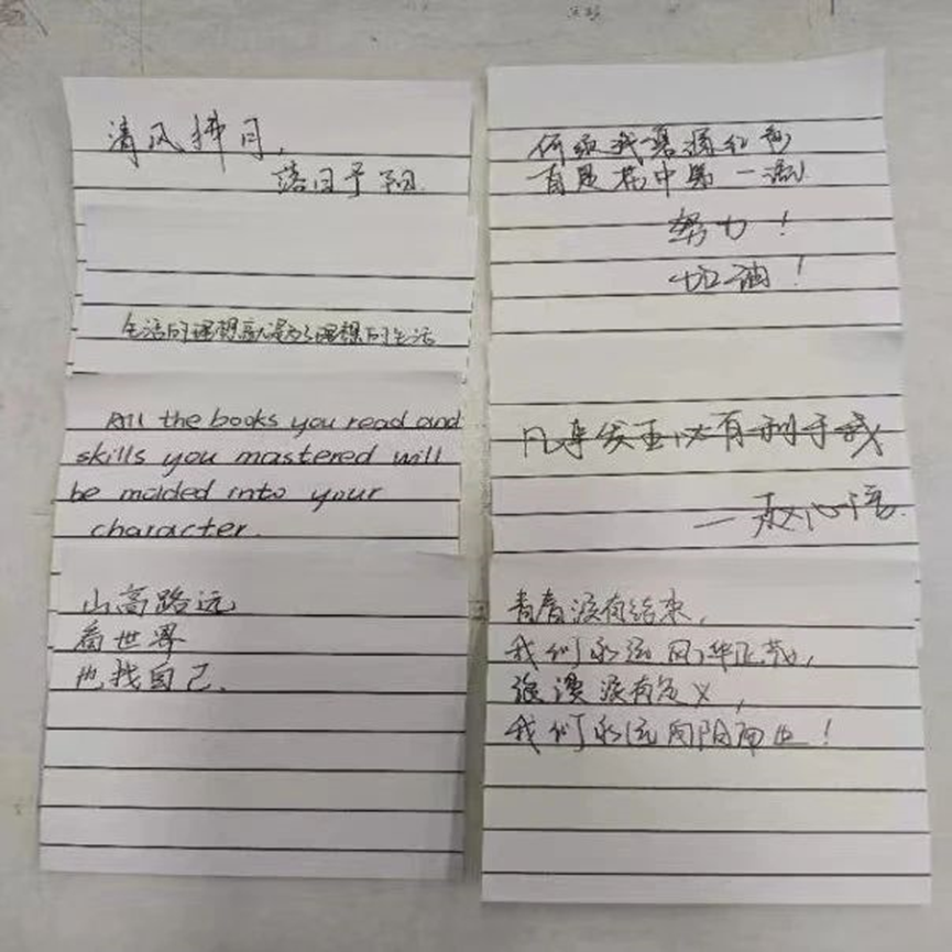 随后,张静雯组织同学们在彩色卡纸上写下自己近日来的压力与烦恼,将卡纸折成纸飞机飞向远方,象征着同学们的压力与烦恼的抽离,并鼓励同学们把激励自己的话写在便利贴上,在班会结束后将便利贴贴在自己的名字旁。