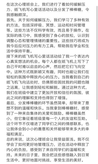本次心理健康主题班会的成功举办,不仅提高了员工对心理健康的重视程度,也为他们提供了实用的心理调适工具和资源。同学们纷纷表示,通过此次轻松愉快的心理班会,我们学会了如何更好地理解和照顾自己的心理健康,正确看待和面对压力,不内耗,不焦虑,寻找适合的方法缓解压力。