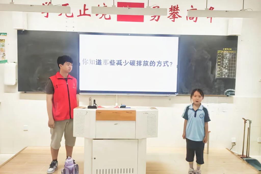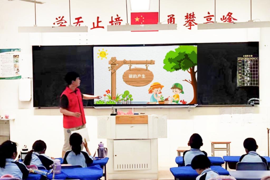 志愿者围绕碳的产生、绿色生活以及如何践行低碳生活三个方面展开叙述。活动伊始,他向小朋友们提出“你知道地球一年产生多少二氧化碳吗?”“你知道哪些减少碳排放的方式?”等一系列问题,引导他们去思考保护环境、节能减排的重要意义。随后,他告诉小朋友们要用实际行动去传播低碳理念,从衣、食、住、行各方面践行绿色低碳生活方式。节能低碳是美德,是责任,更是一种生活态度。最后,他鼓励小朋友们在日常生活中践行低碳理念,让节能成为习惯,让节能成为健康生活方式。