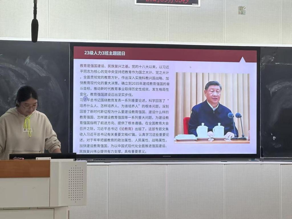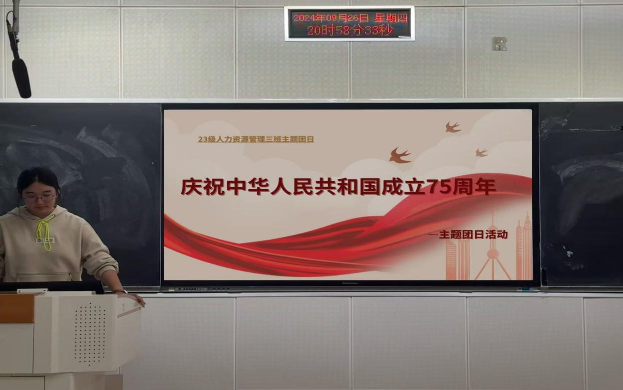 为弘扬爱国主义精神,增强同学们的民族自豪感和责任感,激励广大青年学子为实现中华民族伟大复兴的中国梦贡献力量。10月22日,伟德bv国际体育2023级人力资源管理专业三班开展了以“庆祝中华人民共和国成立75周年”为主题的团日活动,本次团日活动由团支书杜悦涵主持,2023级人力资源管理专业三班全体同学参加。