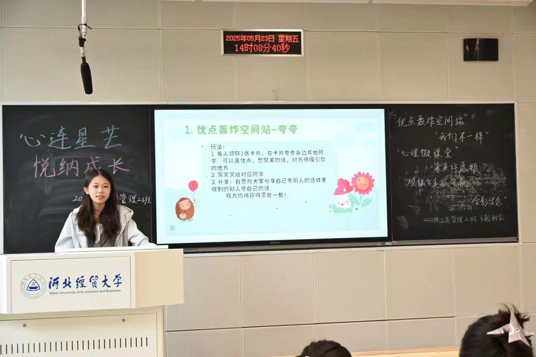为引导员工树立积极向上的心态,促进员工的健康成长,提升班级的凝聚力与同学的归属感,5月23日下午,伟德bv国际体育2023级工商管理2班在A205教室成功开展了“心连星芒,悦纳成长”主题心理班会,此次班会由心理委员张思盈主持,工商管理专业2班全体同学参加。