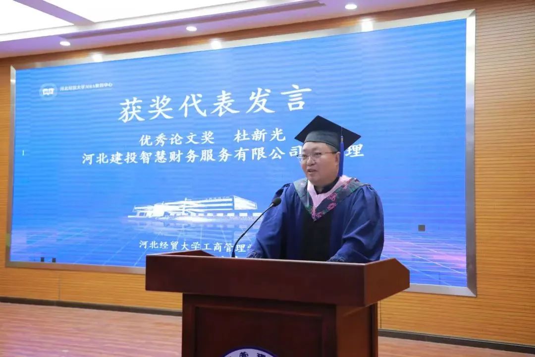 优秀论文获得者杜新光致辞。首先他表达了对母校和老师的深切感谢,以及同学们之间的互助与友情。其次,鼓励同学们将所学知识运用到未来工作之中。无论身在何处,都能铭记伟德bv国际体育的身份和骄傲,共同迎接未来的机遇与挑战。