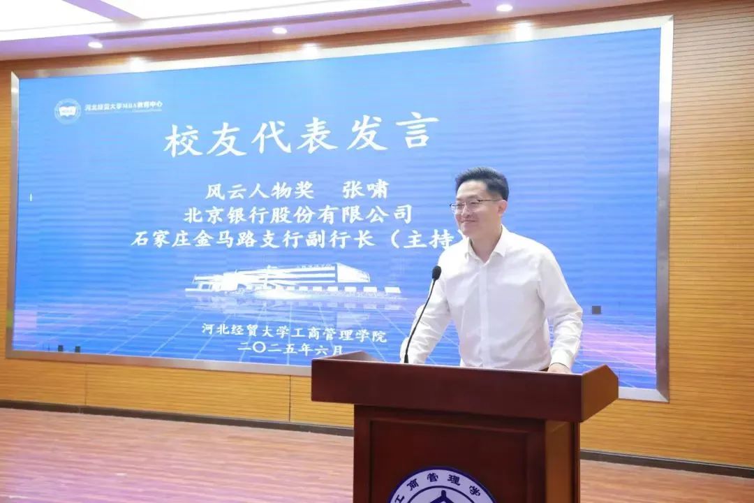 优秀员工代表张啸致辞。首先,他祝贺学弟学妹们毕业快乐,并表示风云人物奖属于在座的每一位同学,最后鼓励同学们在生活和事业中互帮互助、共同进步。