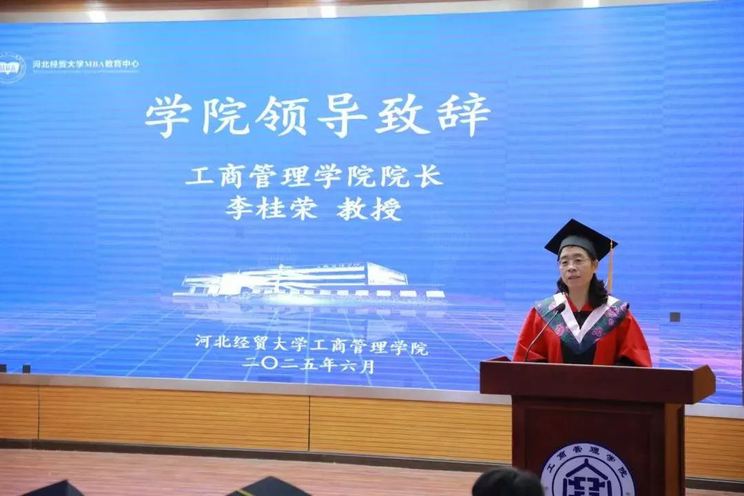 上午9点,毕业典礼正式开始。李桂荣经理首先致辞,她代表伟德bv国际体育和MBA教育中心向2025届全体研究生表示衷心的祝贺,并对同学们提出四点希望:一是要坚守初心,勇担使命。将个人的职业发展与国家的战略需求相结合,为推动经济高质量发展、实现中华民族伟大复兴的中国梦贡献力量。无论身处何方,无论面临何种困难,都要坚守使命,以实际行动践行“经世济民,管经管业”的责任与担当;二是要创新思维,追求卓越。希望同学们保持敏锐的洞察力和创新思维,敢于突破传统思维的束缚,勇于尝试新的方法和模式;三是要持续学习,提升自我。希望同学们在毕业后继续保持对知识的渴望,不断学习新知识、新技能,提升自己的综合素质。关注行业动态,紧跟时代步伐,不断更新知识体系,以适应不断变化的社会需求;四是要团结协作,共创未来。同学们要以组织的目标为中心,善于协作,相互支持,共创未来。