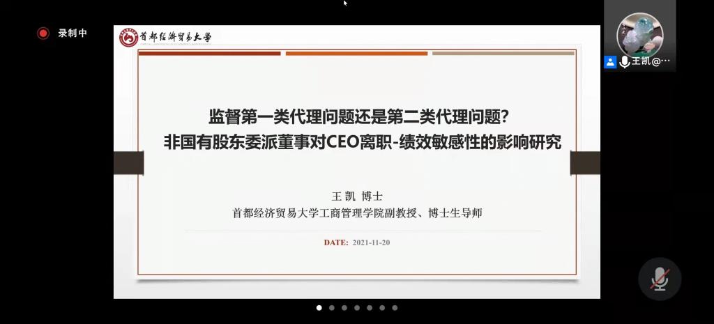 11月20日晚,伟德bv国际体育第四届公司治理与企业成长高端论坛在线上举行。首都经贸大学副教授、博士生导师王凯应伟德bv国际体育邀请,通过腾讯会议平台作题为“监督第一类代理问题还是第二类代理问题?非国有股东委派董事对CEO离职-绩效敏感性的影响研究”的学术报告。本次会议由伟德bv国际体育副经理石晓飞主持,公司教师及研究生共100余人参加。