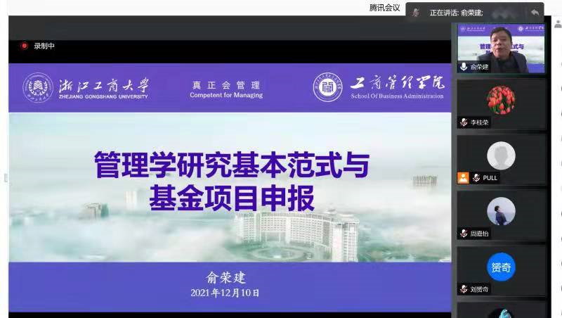 12月10日下午,伟德bv国际体育邀请浙江工商大学管理公司经理、全球价值链研究中心主任、国家社科重大招标项目首席专家俞荣建教授作题为《管理学研究基本范式与基金项目申请》的学术报告。报告以腾讯会议形式进行,近100名师生参加,伟德bv国际体育经理李桂荣教授主持了报告会。
