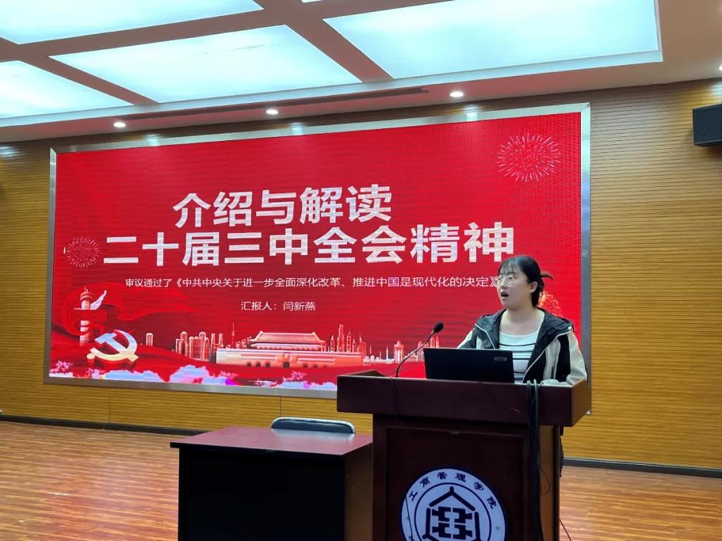 2024级工商管理专业研究生闫新燕在微党课上深入解读中国共产党第二十届中央委员会第三次全体会议《决定》。《决定》共提出300多项重要改革举措,涉及制度、经济、民生等层面的内容,其中有的是对过去改革举措的完善和提升,有的是根据实践需要和试点探索新提出的改革举措。她指出,在制度层面,《决定》强化党的领导与建设,力克干部不作为乱作为,明确深化改革总目标。经济层面,改革旨在弘扬企业家精神,建设世界一流企业;针对房地产市场挑战,提出平衡放缓与培育新增长点的策略,以多元化方式推动经济高质量发展。民生层面,确立高标准市场体系建设的三大改革要点,强调增加低收入群体收入、稳步扩大中等收入群体规模、合理调节过高收入的制度体系。最后,闫新燕指出《决定》还涉及完善法治体系、教育体系等几项关键内容,展现了党中央在新时代背景下全面深化改革的坚定决心与全面布局。