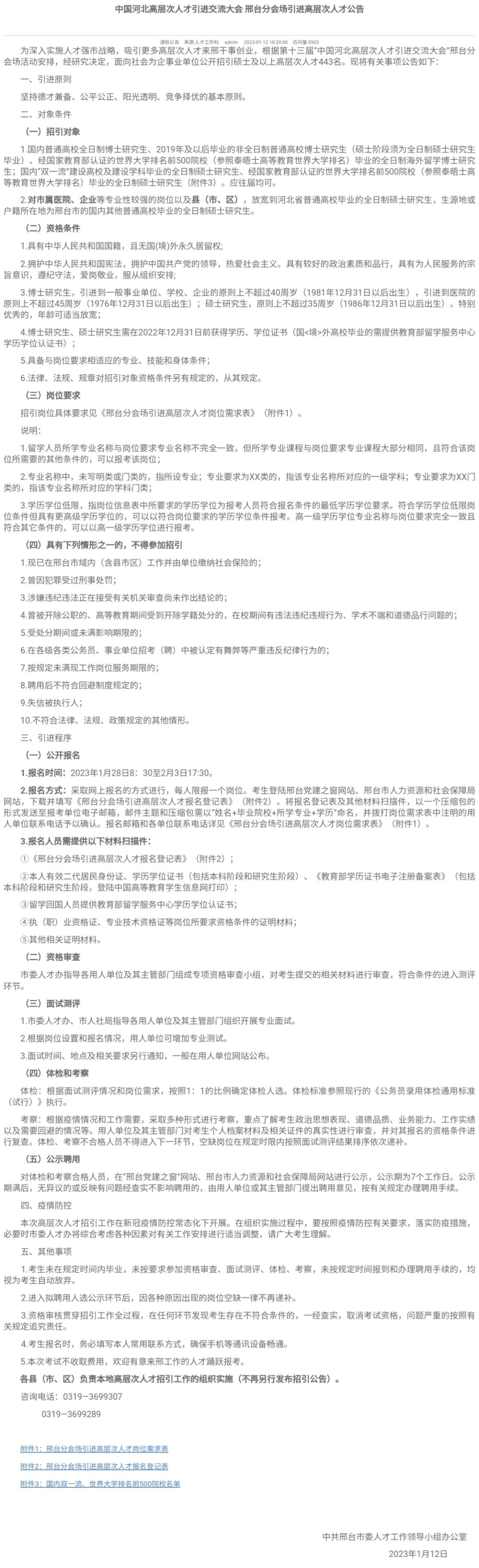 采取网上报名的方式进行,每人限报一个岗位。考生登陆邢台党建之窗网站、邢台市人力资源和社会保障局网站,下载并填写《邢台分会场引进高层次人才报名登记表》(附件2)。将报名登记表及其他材料扫描件,以一个压缩包的形式发送至报考单位电子邮箱,邮件主题和压缩包需以“姓名+毕业院校+所学专业+学历”命名,并拨打岗位需求表中注明的用人单位联系电话予以确认。