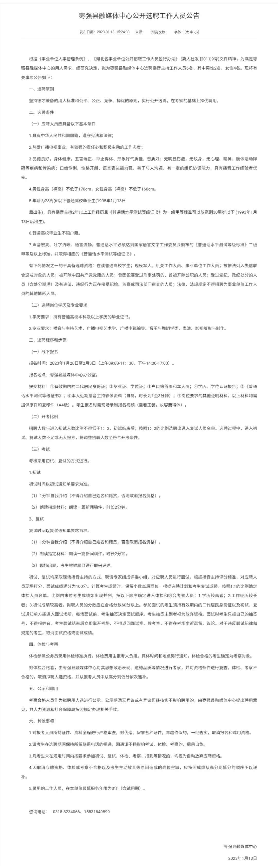 枣强县融媒体中心拟选聘播音主持工作人员6名,其中男性2名、女性4名。