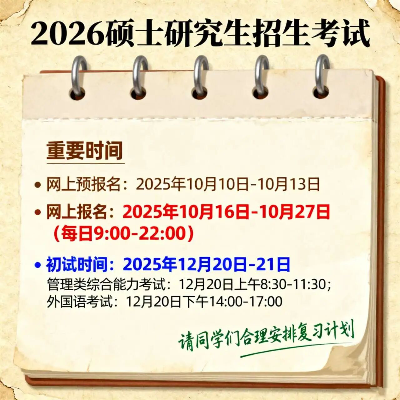 根据统一安排,2026年全国硕士研究生招生初试时间为2025年12月20日至21日,其中管理类综合能力考试时间为12月20日上午8:30-11:30,外国语考试时间为12月20日下午14:00-17:00。请同学们合理安排复习计划。