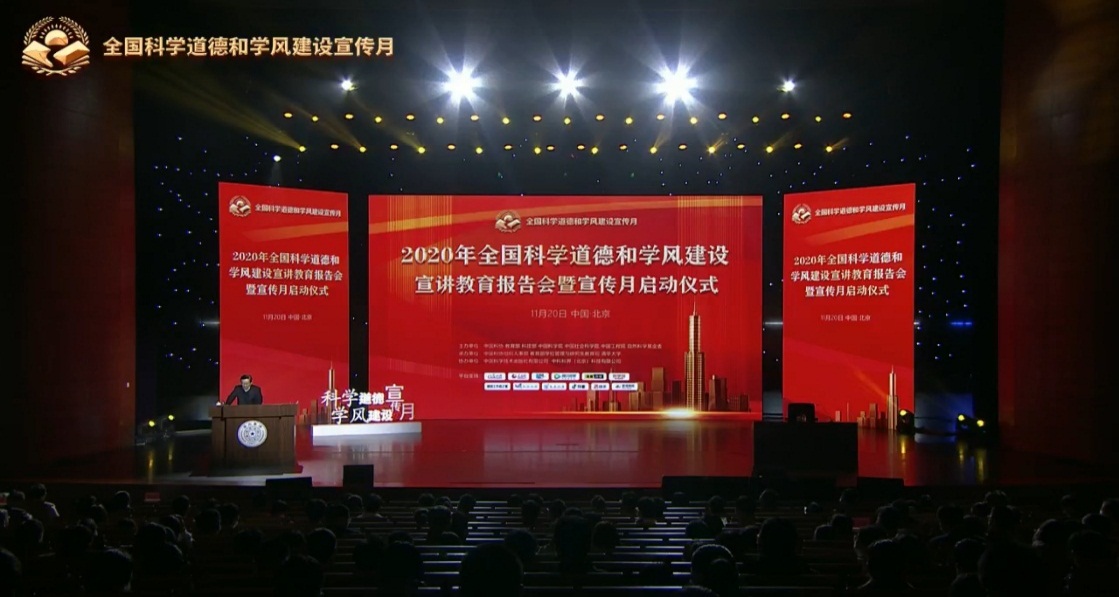 中国科学技术协会党组书记、常务副主席、书记处第一书记怀进鹏主持会议,首先,全体起立奏唱中华人民共和国国歌,其次,怀进鹏书记宣布全国科学道德和学风建设宣讲教育正式开始。最后,介绍了出席会议的嘉宾。接下来由十三届全国政协副主席,致公党中央主席,中国科学技术协会主席,暨南大学董事长万钢为此次报告会致辞。并介绍此次的嘉宾是前敦煌研究院经理樊锦诗院士和神舟飞船总设计师戚发轫院士。