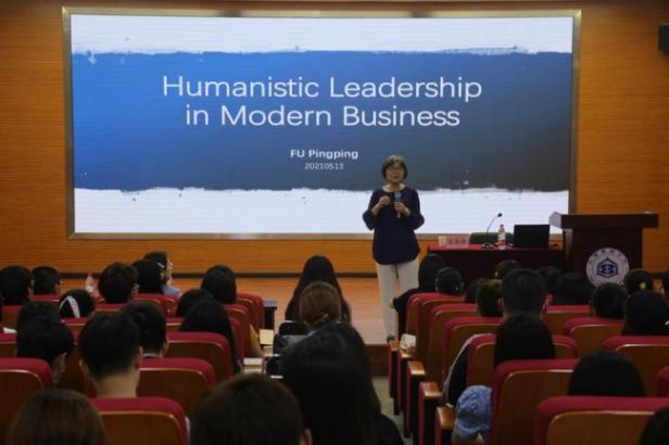 富萍萍教授首先阐述了学习哲学的重要性和目的,即哲学是帮助人了解人生的“高尔夫球”——世界观、人生观、价值观;通过结合自己年轻时一边工作一边自学英语的人生经历,勉励大家要学会明确学习目标和珍惜学习时光。接下来,富萍萍教授从中国古代经典哲学角度分析企业“领导力”,系统地讲解了现代企业在时代潮流影响下如何可持续、高质量发展,并通过苏州固锝公司、方太集团、苏州德胜洋楼、黄骅信誉楼等四个案例来说明新型的商业领袖注重员工人文关怀、“以人为本”,把员工作为目的,而非手段,继而把员工应该做的事变成喜欢做的事。最后,富萍萍教授与在场师生互动,解答了同学们提出的问题。富萍萍教授学贯中西、风趣幽默,报告会全程精彩连连,同学们纷纷表示得到思想上的启迪和精神上的洗礼,受益匪浅。