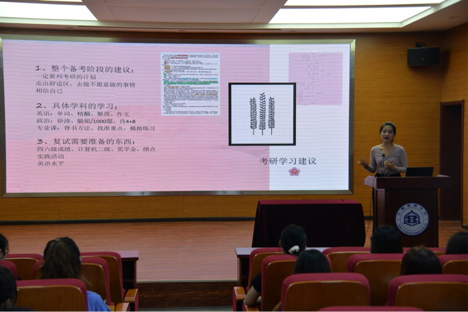 2017级人力资源管理(中外合作办学)二班边天琪和2017文化产业管理一班柳茜从考研动机、考研择校、考研建议等方面分享考研经验,并鼓励学弟学妹们明确自身定位,努力学习知识,为考研做好充分准备。2017级文化产业管理一班王洁和范亚男,围绕职业定位与规划、职业准备与努力、实战之校园招聘等要点分享就业经验,建议同学们充分利用大学时光,苦练本领、发挥优势,争取在新时代就业浪潮中脱颖而出。