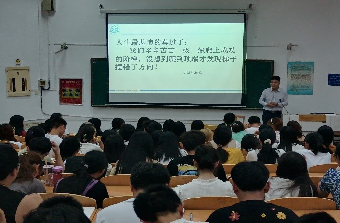 石晓飞分享了自己的大学经历并由此提出“为什么要考大学”、“大学四年怎么过”、“走出大公司门的那一天,你去哪”、“转专业?专业分流?”四个关键问题,引导同学们思考奋斗方向并积极交流发言。最后,石晓飞总结道:“人生最悲惨的莫过于我们辛辛苦苦一级一级爬上成功的阶梯,没想到爬到顶端才发现梯子摆错了方向!”