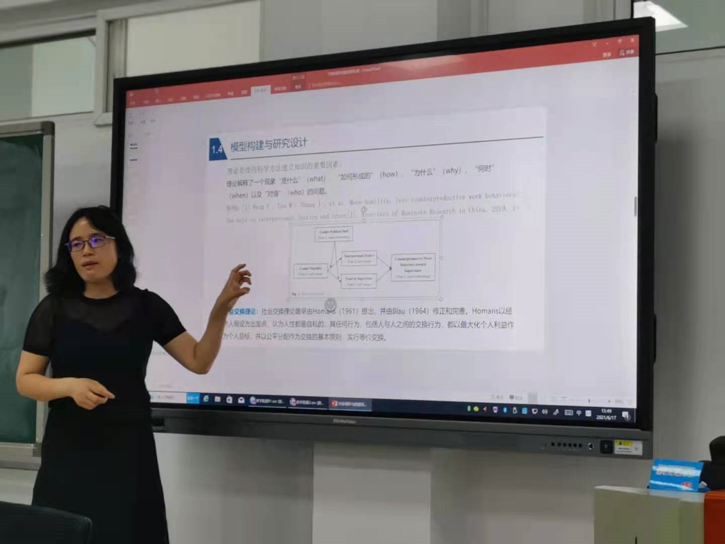 张静老师指出研究应先明“道”后学“术”,以“为什么做研究”这一问题,引出科学研究的目标、过程及方法等基本概念。张静老师从“问卷设计”“问卷发放”“数据预处理”等几个部分进行讲述。首先,结合自身研究经历,总结出在数据收集之前要对所建立的模型做多种预备方案,以减少出现变量间关系不显著的概率。其次,在问卷设计过程中,为保证最终数据的信度及效度,选择量表应参考权威期刊中采用的量表,并对发放问卷的形式和注意事项进行了介绍。最后,基于“SPSS”软件演示了问卷数据信度及效度的检验过程。