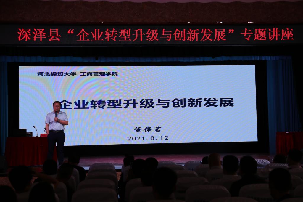 签约仪式后,董葆茗副教授以“企业转型升级与创新发展”为题,为深泽县企业家作专题讲座。他从国内外环境分析、企业转型升级方向、创新发展路径和加大人才培养等几个方面进行了详细讲授,为深泽县培养和造就一批高素质企业家和后备人才队伍、实现产业转型升级积极助力。与会企业家代表表示,董教授的报告站位高、视角新、接地气,对帮助深泽县中小企业开拓视野、开阔胸襟,转变发展思想,抢抓发展机遇,培育创新意识起到了积极作用。