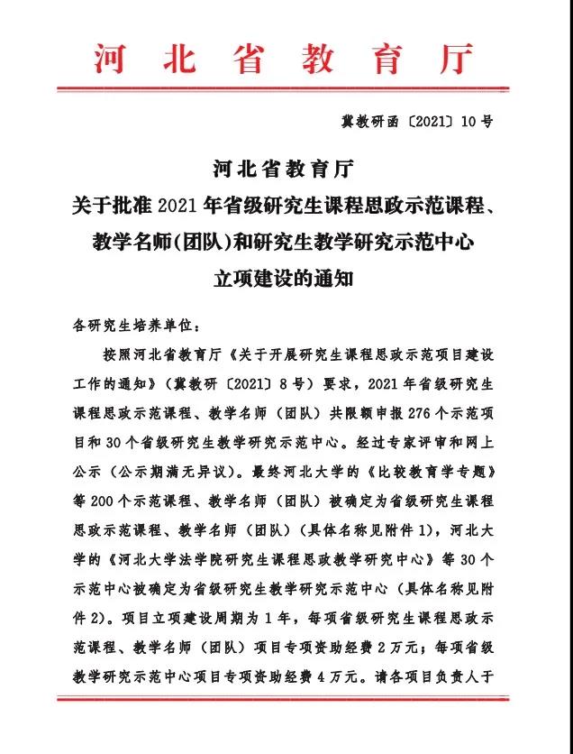 2021年10月28日,河北省教育厅发布了2021年省级研究生课程思政示范课程、教学名师(团队)和研究生教学研究中心批准立项建设的通知。伟德bv国际体育研究生课程思政教学研究中心被确定为省级研究生教学研究示范中心。公司石晓飞副教授的公司治理课程、郑伟波教授的人力资源管理(MBA)课程及桑银峰副教授的营销管理课程入选2021年伟德bv国际体育校级研究生课程思政示范中心立项建设项目,为提高公司研究生教学工作成效和研究生人才培养水平提供了有力支撑。