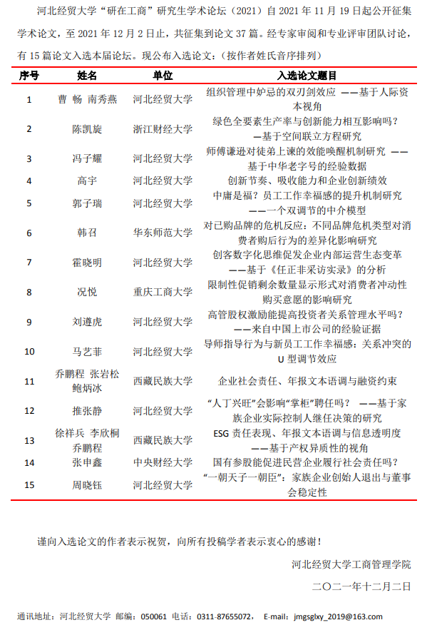 伟德bv国际体育“研在工商”研究生学术论坛(2021)入选论文通知