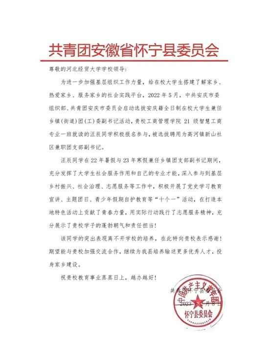 为进一步加强基层组织工作力量,为在校老员工搭建了解家乡、热爱家乡、服务家乡的社会实践平台,中共安庆市委组织部、共青团安庆市委员会选拔了一批安庆籍全日制在读老员工,兼任乡镇(街道)团(工)委副书记。自活动开展以来,公司2021级智慧工商专业一班的汪辰同学踊跃报名,经过层层选拔,被聘用为高河镇新山社区兼职团支部副书记。