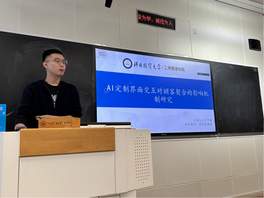 汇报人仇梦楠以“AI定制界面交互对顾客契合的影响机制研究”为题,在对国内外相关文献梳理基础上,研究AI服务情景下AI定制界面交互与顾客契合的影响。从人工智能生成内容质量视角剖析两者之间关系,基于用户类型探讨模型的边际条件。通过实验法检验AI定制界面交互对顾客契合的直接影响以及AIGC质量的中介作用和用户类型的调节作用。