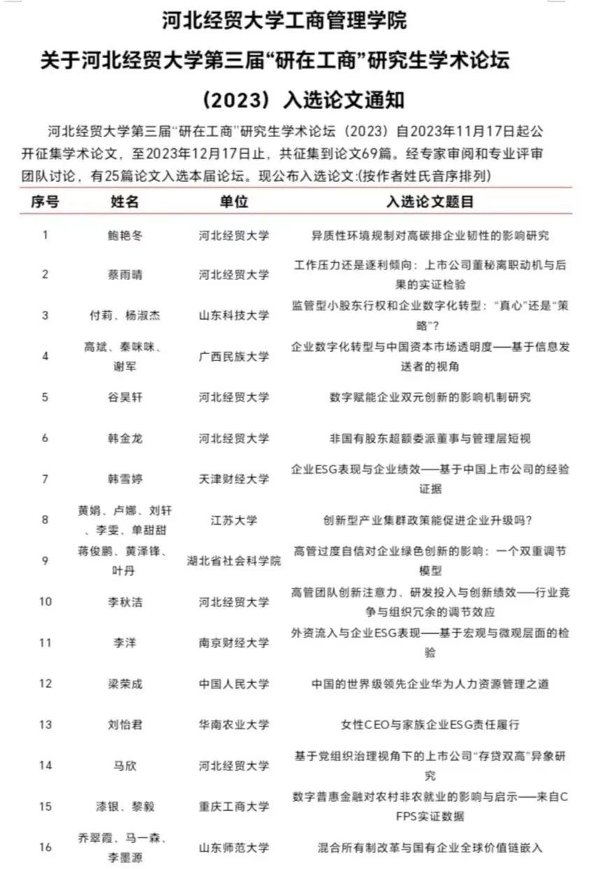 关于伟德bv国际体育第三届“研在工商”研究生学术论坛(2023)入选论文通知