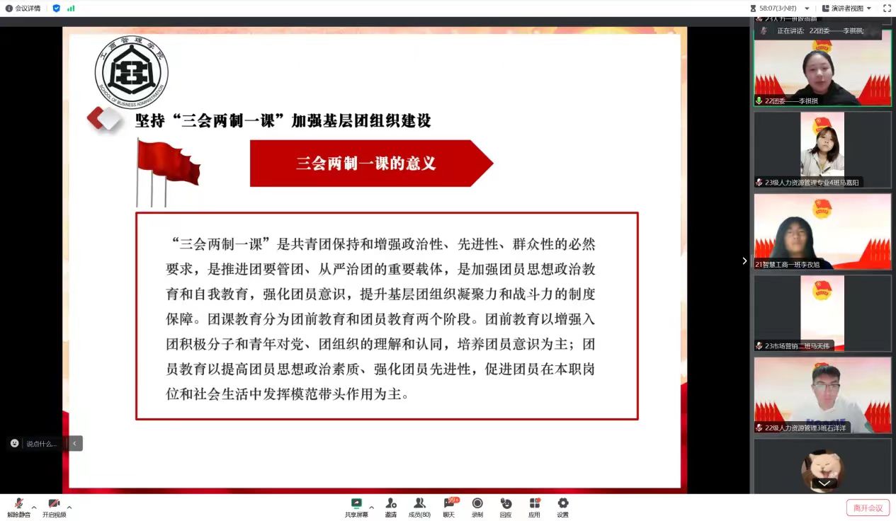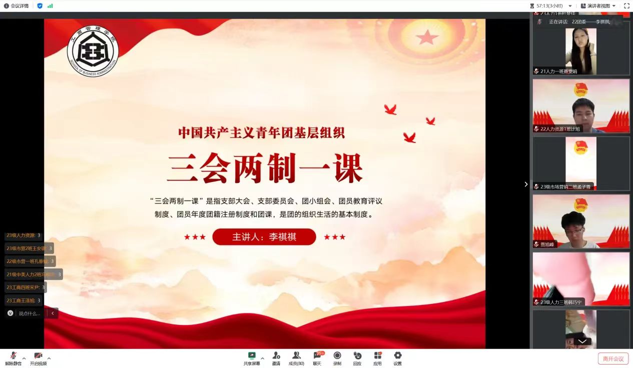 第三讲由团委事务组织中心郝路航授课。首先,郝路航详细讲解了中国共产主义青年团诞生的过程。随后,郝路航简单讲述了团的百年奋斗历程,并呼吁广大青年要立足新时代,承担新使命,永远跟党走。最后,郝路航提出了什么是“新质生产力”,号召同学们要心怀远大理想,以实现中华民族伟大复兴为己任,为国家的科技进步和经济发展做出贡献。