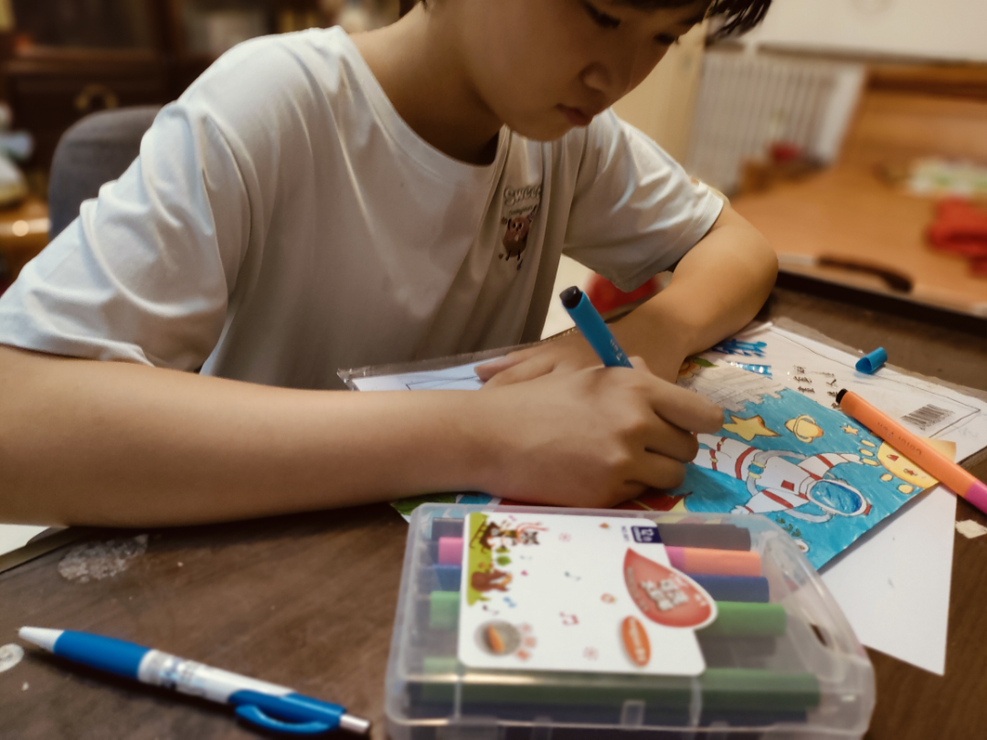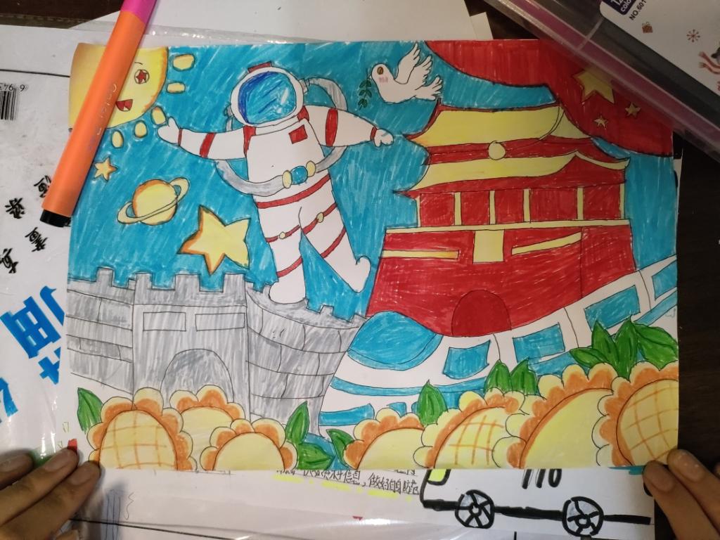 回到家后,我和妹妹一起观看了展示中国成就的视频,她感到很震撼,并且说“我为我的祖国感到骄傲。”看到中国的飞速发展,我们想象了心中祖国的未来,妹妹认为中国是强大的、安全的、便利的,如果中国有颜色那一定是红色。经过我们的交流,妹妹用心地把她眼中的祖国画了出来。