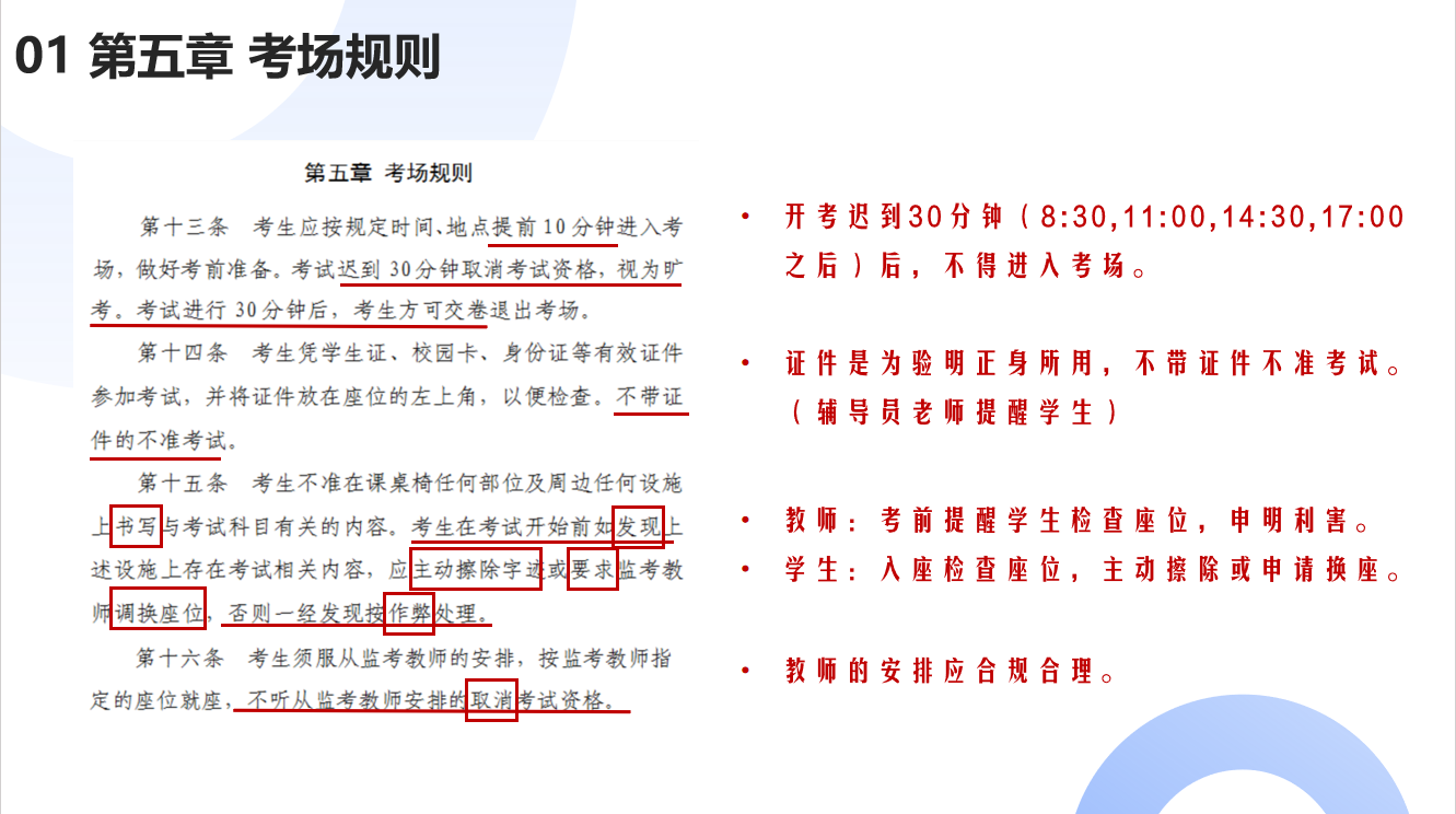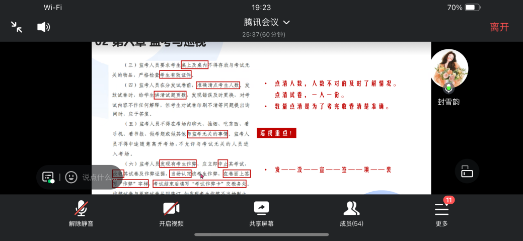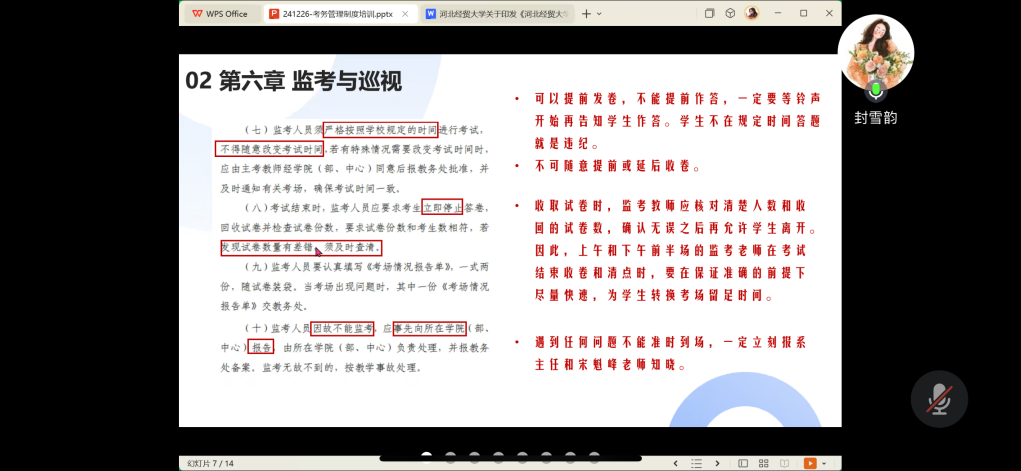 封雪韵聚焦《伟德bv国际体育普通本科教学考务管理制度》,从考场规则、监考与巡视和考试纪律等3方面带领全体教师认真学习《制度》的第五、六、七章。她首先详细解读考场规则,对考场环境布置、考生座位安排、考试时间把控等细节进行明确规范,确保考试的严肃性与规范性。然后,她详细讲解了监考教师的监考职责与工作流程,从考前检查、证件核对,到考中监考、突发事件处理,以及巡视员的巡查重点与路线规划,确保全方位保障考试秩序。在考试纪律部分,她着重解读违纪和作弊的认定办法,帮助老师们清晰界定如携带违规物品、抄袭、协助作弊等各类行为的表现形式与判别标准,有利于大家准确把握尺度,做到纪律严明、评判有据。