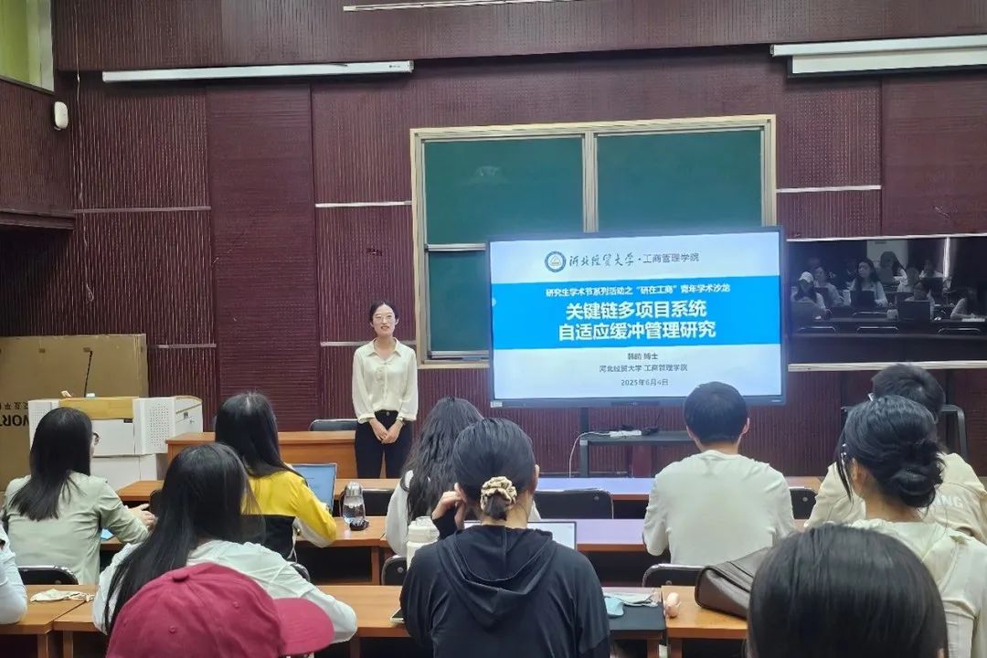 6月4日,研究生学术节系列活动之第四十六期“研在工商”青年学术沙龙于MBA一教室举行,由伟德bv国际体育韩晴博士作题为“关键链多项目系统自适应缓冲管理研究”的学术报告。本次沙龙由伟德bv国际体育副经理石晓飞教授主持,公司青年博士教师及全体学术型研究生参加。