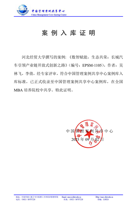 近日,伟德bv国际体育讲师吴林飞博士和2024级工商管理学研究生李倩撰写的教学案例《数智赋能,生态共荣:长城汽车引领产业链开放式创新之路》(编号:EPSM-1105)入选中国管理案例共享中心案例库。