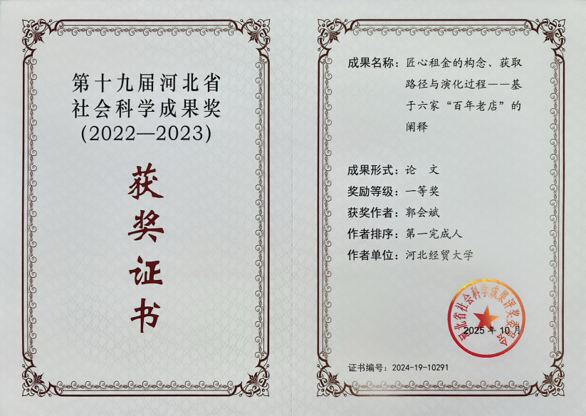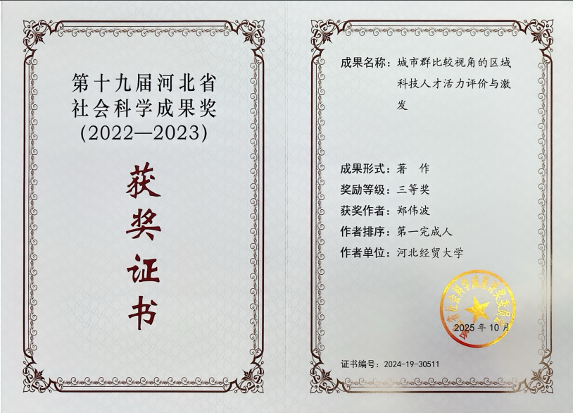 河北省社会科学优秀成果奖是由河北省人民政府授权河北省社会科公司设置,旨在表彰为推动党的创新理论体系化学理化研究、加快构建中国社会科学自主知识体系、服务经济社会高质量发展作出重要贡献的我省优秀成果。该奖项每两年评选一次。经严格评选程序,第十九届河北省社会科学优秀成果奖共评选出奖励成果290项,其中特别奖3项,一等奖35项、二等奖110项、三等奖142项。