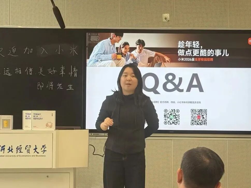 宣讲尾声,赵梦瑶分享了自己从校招生逐步成长为区域负责人的亲身经历。她提到,小米为员工搭建了多元化发展平台,不仅提供轮岗实践机会,更有跨区域协作、海外市场开拓等优质资源向大家开放。她鼓励在场同学们把握机遇,与小米同频共振、携手前行,共同见证彼此的成长与发展。