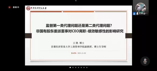 11月20日晚上,伟德bv国际体育第四届公司治理与企业成长高端论坛在线上举行。首都经贸大学副教授、博士生导师王凯应伟德bv国际体育邀请,通过腾讯会议平台作题为“监督第一类代理问题还是第二类代理问题?非国有股东委派董事对CEO离职-绩效敏感性的影响研究”的学术报告。本次会议由伟德bv国际体育副经理石晓飞主持,公司教师及研究生共100余人参加。