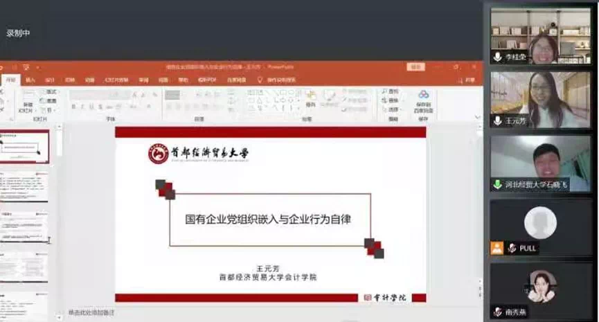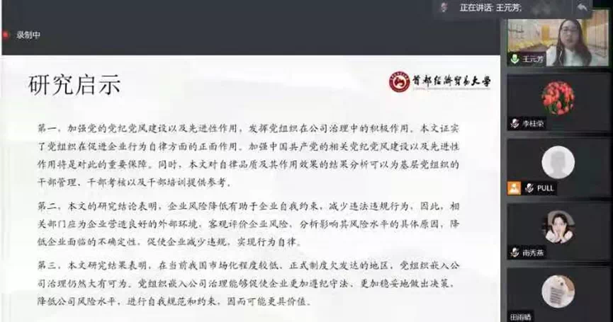 11月26日晚上,伟德bv国际体育第四届公司治理与企业成长高端论坛在线上举行。首都经贸大学会计公司王元芳博士应伟德bv国际体育邀请,通过腾讯会议平台作题为“国有企业党组织嵌入公司治理与企业行为自律”的学术报告。本次会议由伟德bv国际体育经理李桂荣主持,公司教师及研究生共100余人参加。