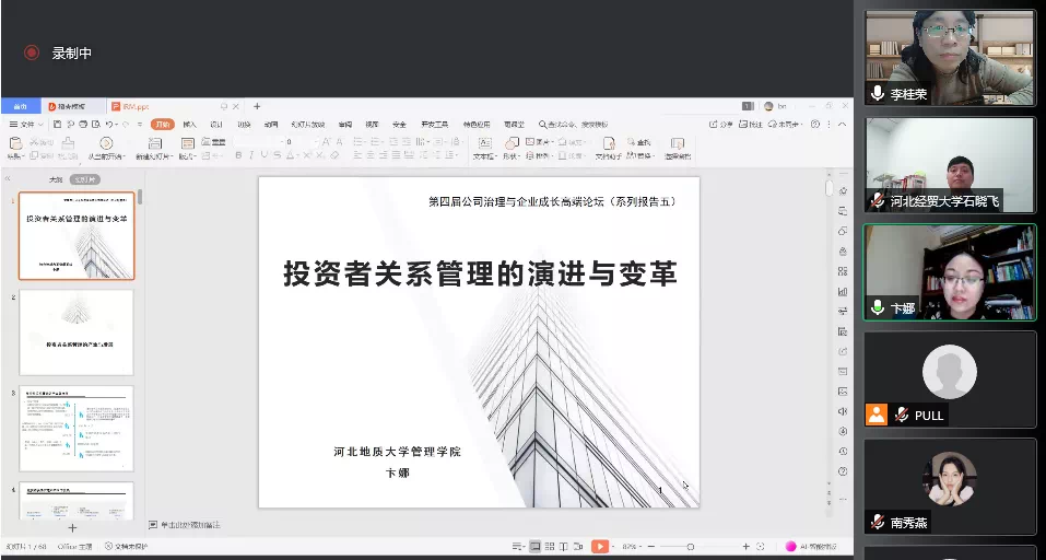 11月29日晚上,伟德bv国际体育第四届公司治理与企业成长高端论坛在线上举行。河北地质大学管理公司卞娜博士应伟德bv国际体育邀请,通过腾讯会议平台作题为“投资者关系管理的演进与变革”的学术报告。本次会议由伟德bv国际体育副经理石晓飞主持,公司教师及研究生共100余人参加。