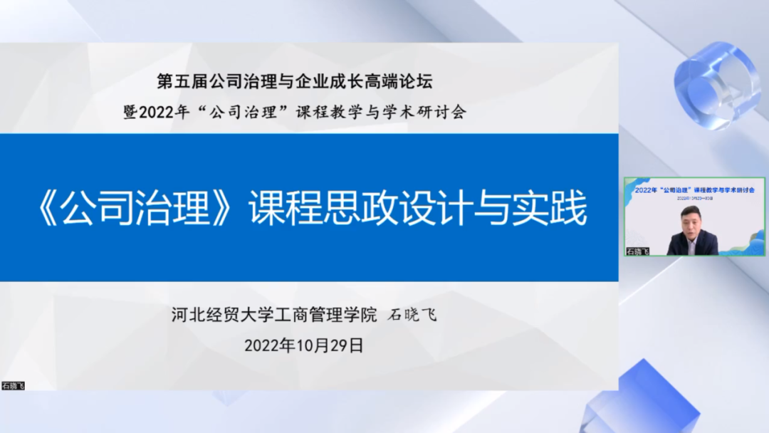 10月29日下午,石晓飞副教授和沈小秀副教授分别作题为“《公司治理》课程思政设计与实践”和“体验沉浸式教学——《公司治理》示范课”报告。