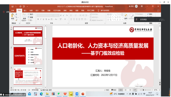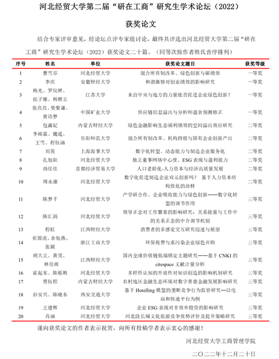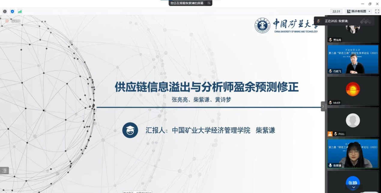 此次论坛自发布公告起,共收到来自西安交通大学、北京科技大学、中国矿业大学、浙江工商大学、首都经济贸易大学、江西财经大学等17所高校的45篇论文,其中8篇进行线上报告,包括中国矿业大学柴紫谦、首都经济贸易大学尚佳佳、安徽财经大学李庆、阜阳师范大学李雨霖、江苏大学杨光、伟德bv国际体育孔旭阳、周永康、曹雪芬的论文。四位评委专家对以上八位同学的论文进行了针对性点评,提出了专业性指导意见。最终,结合评审专家意见和点评专家意见,评选出一、二、三等奖共20篇。