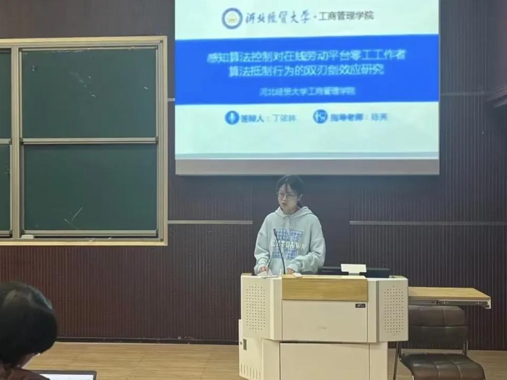 汇报人贾珮艺以“算法管理对员工的离职倾向的影响研究”为题,分析了算法管理如何通过改变工作内容和特性给员工带来压力,并可能促使员工选择离职来缓解这种压力。研究以算法管理为自变量,离职倾向为因变量,根据认知评价理论和资源保存理论,选取挑战性—阻碍性压力作为双中介变量进行实证研究,探讨了在数字化背景下算法管理对员工离职倾向的影响,旨在提出有效建议以减轻员工压力和降低离职倾向。