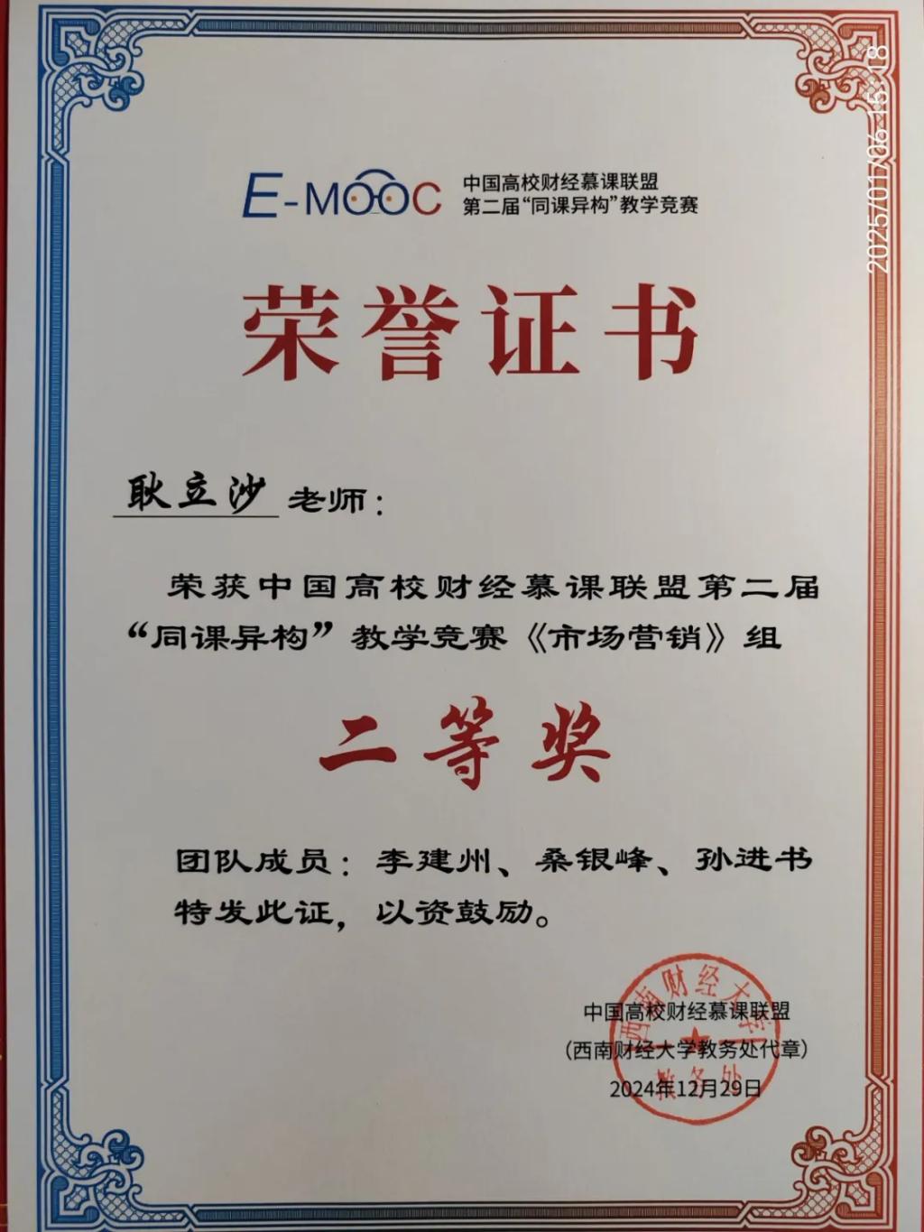 2024年12月29日,中国高校财经慕课联盟第二届“同课异构”教学竞赛颁奖典礼在天津财经大学隆重举行,伟德bv国际体育耿立沙副教授代表市场营销教学团队参赛,荣获该教学竞赛二等奖。