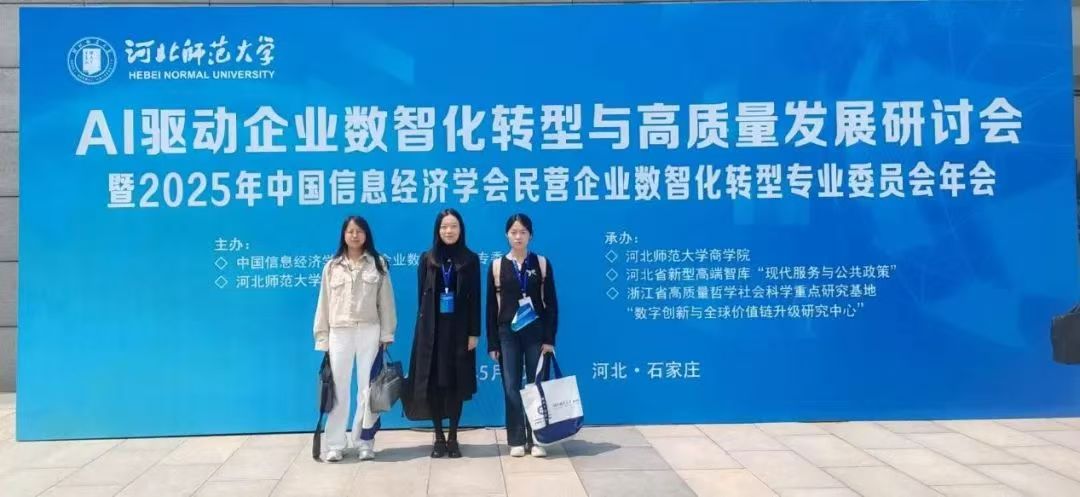 2025年5月10日,公司张羽飞博士及硕士研究生高霄琦、刘燕花应邀参加了由中国信息经济学会民营企业数智化转型专委会、河北师范大学主办,河北师范大学商公司、河北省新型高端智库“现代服务与公共政策”、浙江省高质量哲学社会科学重点研究基地“数字创新与全球价值链升级研究中心”承办的“AI驱动企业数智化转型与高质量发展研讨会暨2025年中国信息经济学会民营企业数智化转型专业委员会年会”。本次大会受到了学术界与实践界的广泛关注和热烈响应,来自全国几十所高校与科研院所的专家学者出席了本次盛会。